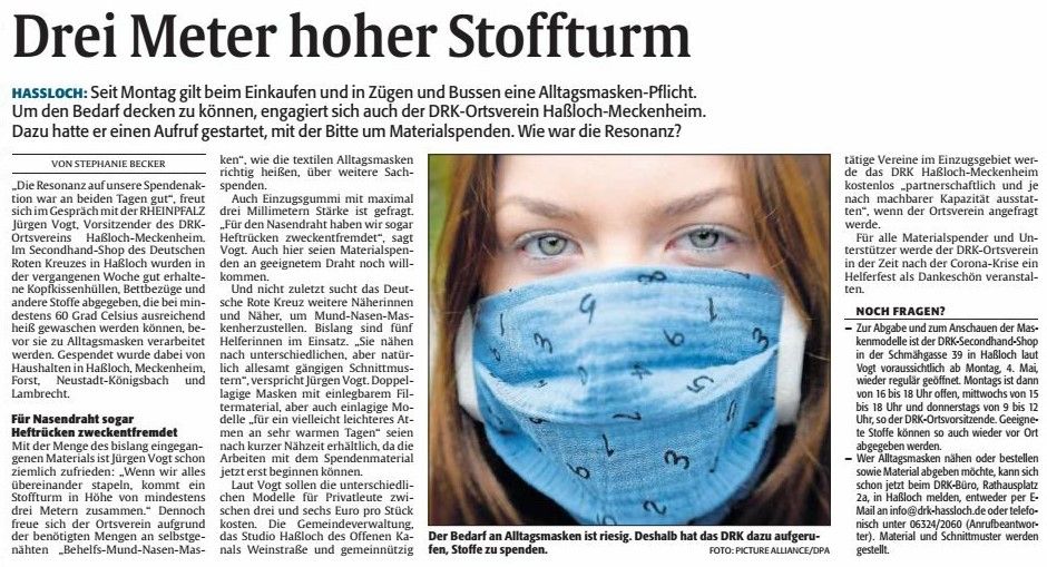 - Zur Abgabe und zum Anschauen der Maskenmodelle ist der DRK-Secondhand-Shop in der Schmähgasse 39 in Haßloch laut Vogt voraussichtlich ab Montag, 4. Mai, wieder regulär geöffnet. Montags ist dann von 16 bis 18 Uhr offen, mittwochs von 15 bis 18 Uhr und donnerstags von 9 bis 12 Uhr, so der DRK-Ortsvorsitzende. Geeignete Stoffe können so auch wieder vor Ort abgegeben werden. - Wer Alltagsmasken nähen oder bestellen sowie Material abgeben möchte, kann sich schon jetzt beim DRK-Büro, Rathausplatz 2a, in Haßloch melden, entweder per E-Mail an
