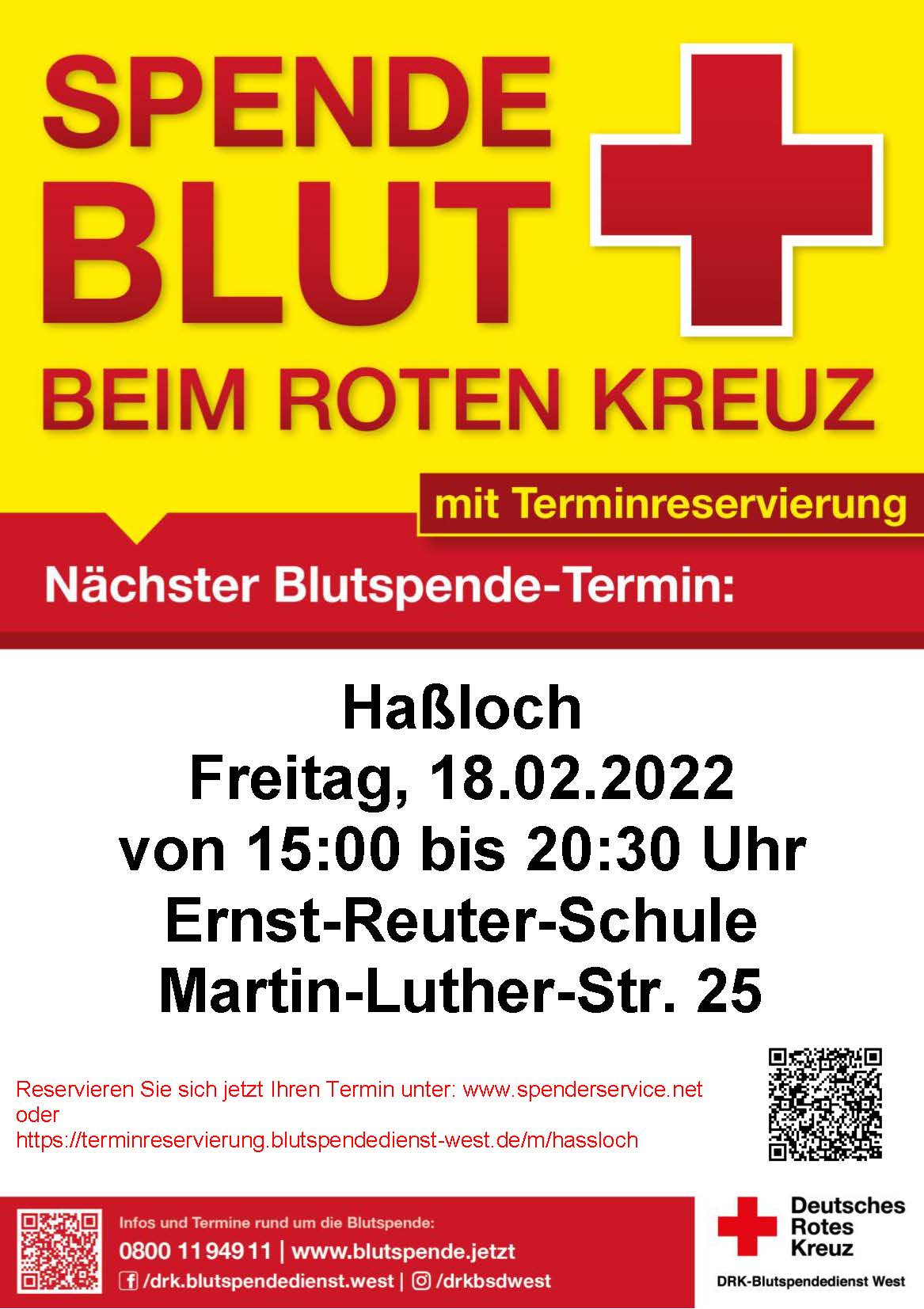 Gerade jetzt wichtig:Blutspenden in Zeiten der LockerungenHaßloch. Am Freitag, den 03.09.2021 ruft das Rote Kreuz in Haßloch zur Blutspende auf. Blutspender sind von 15:00 – 20:30 Uhr in der Turnhalle der Ernst-Reuter-Schule, Martin-Luther-Str. 25, herzlich willkommen.
